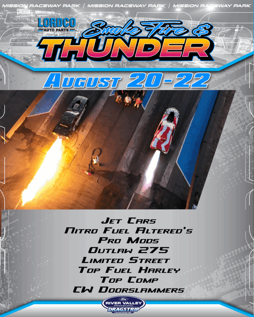 The biggest, baddest, best show of the summer is Lordco Parts Ltd. Smoke, Fire and Thunder, and it’s back August 20-22nd 2026! Jet Cars, Nitro Fuel Altereds, Pro Mods, Outlaw 275, and more come to the River Valley Ford Dragstrip for an entire weekend of insane burnouts, horsepower and good times!